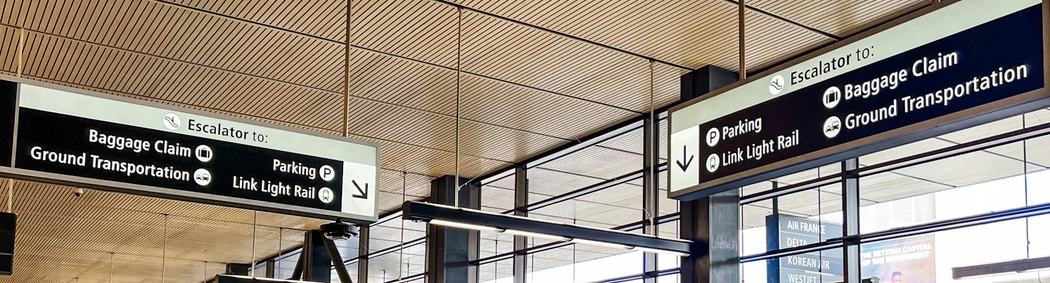 Since 2000, Ilium has served as a trusted wayfinding and environmental graphic design partner for Seattle-Tacoma International Airport (SEA), completing a wide range of projects tied to the airport’s ongoing improvements and operational changes. Work has spanned roadway signage planning and design, enplane and deplane vehicular directory signage, ground transportation center signage, and remote employee parking signage. A comprehensive signage standards program was also developed in conjunction with NBBJ, establishing a consistent visual framework for the airport’s evolving signage environment.
